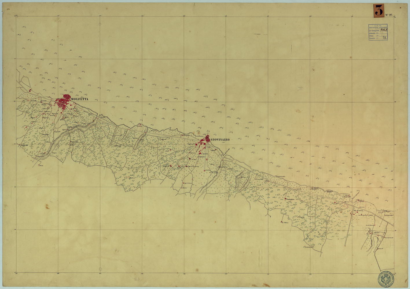 "Sono le levate originali eseguite lungo il litorale adriatico, col concorso dell'idrografo inglese W. Smith, su la base dei rilievi trigonometrici compiuti nel 1817-19 dall'Officio Topografico di Napoli a seguito di quelli già iniziati dagli Ingegneri Geografi del Regno Italico. Sono 44 fogli accuratamente disegnati a penna nello stesso R. Officio Topografico di Napoli. Essi servirono per la "carta di Cabotaggio della Costa del Regno delle Due Sicilie" al 100.000 pubblicata nel 1834. Rappresentano l'orografia con fine tratteggio, abitati e strade in rosso, acque in azzurro, colture e vegetazioni in verde. Gli scandagli sono calcolati in metri e si estendono a 2 Km. dalla costa. La topografia si estende pure per 2 Km. entro terra. Annesso un quadro d'unione. Cfr. Mori A., La Cartografia ufficiale in Italia e l'I.G.M., 1922, pagg. 100-101."