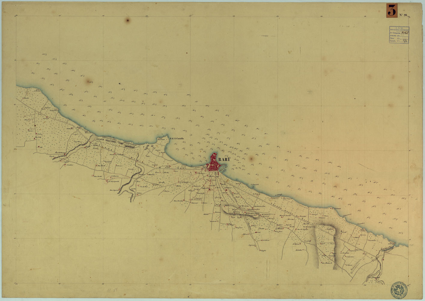 "Sono le levate originali eseguite lungo il litorale adriatico, col concorso dell'idrografo inglese W. Smith, su la base dei rilievi trigonometrici compiuti nel 1817-19 dall'Officio Topografico di Napoli a seguito di quelli già iniziati dagli Ingegneri Geografi del Regno Italico. Sono 44 fogli accuratamente disegnati a penna nello stesso R. Officio Topografico di Napoli. Essi servirono per la "carta di Cabotaggio della Costa del Regno delle Due Sicilie" al 100.000 pubblicata nel 1834. Rappresentano l'orografia con fine tratteggio, abitati e strade in rosso, acque in azzurro, colture e vegetazioni in verde. Gli scandagli sono calcolati in metri e si estendono a 2 Km. dalla costa. La topografia si estende pure per 2 Km. entro terra. Annesso un quadro d'unione. Cfr. Mori A., La Cartografia ufficiale in Italia e l'I.G.M., 1922, pagg. 100-101."