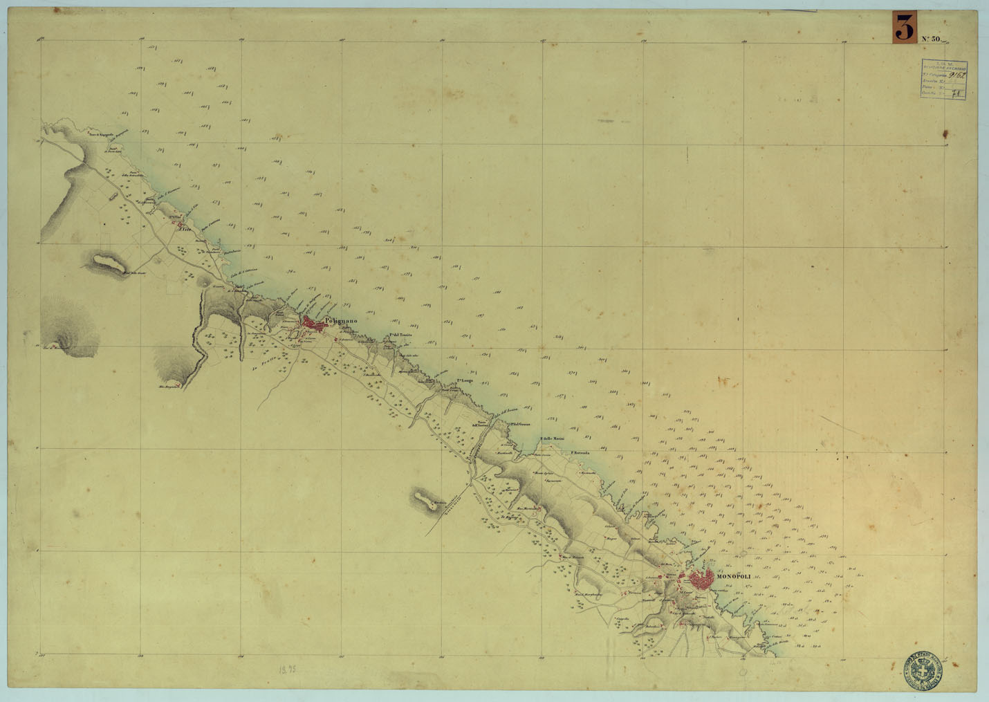 "Sono le levate originali eseguite lungo il litorale adriatico, col concorso dell'idrografo inglese W. Smith, su la base dei rilievi trigonometrici compiuti nel 1817-19 dall'Officio Topografico di Napoli a seguito di quelli già iniziati dagli Ingegneri Geografi del Regno Italico. Sono 44 fogli accuratamente disegnati a penna nello stesso R. Officio Topografico di Napoli. Essi servirono per la "carta di Cabotaggio della Costa del Regno delle Due Sicilie" al 100.000 pubblicata nel 1834. Rappresentano l'orografia con fine tratteggio, abitati e strade in rosso, acque in azzurro, colture e vegetazioni in verde. Gli scandagli sono calcolati in metri e si estendono a 2 Km. dalla costa. La topografia si estende pure per 2 Km. entro terra. Annesso un quadro d'unione. Cfr. Mori A., La Cartografia ufficiale in Italia e l'I.G.M., 1922, pagg. 100-101."