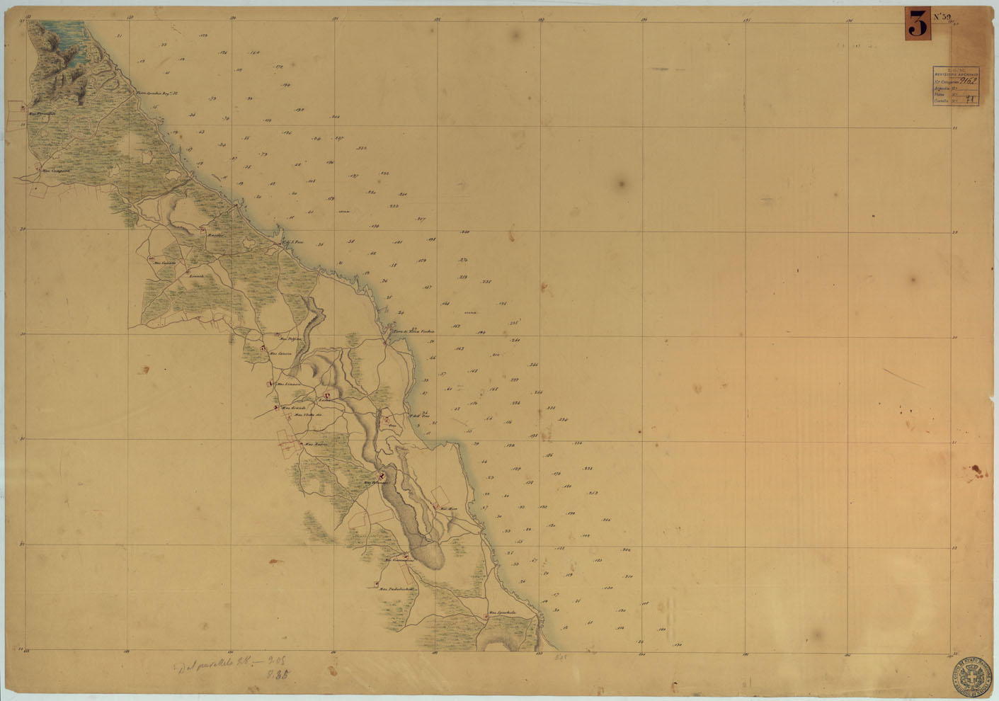 "Sono le levate originali eseguite lungo il litorale adriatico, col concorso dell'idrografo inglese W. Smith, su la base dei rilievi trigonometrici compiuti nel 1817-19 dall'Officio Topografico di Napoli a seguito di quelli già iniziati dagli Ingegneri Geografi del Regno Italico. Sono 44 fogli accuratamente disegnati a penna nello stesso R. Officio Topografico di Napoli. Essi servirono per la "carta di Cabotaggio della Costa del Regno delle Due Sicilie" al 100.000 pubblicata nel 1834. Rappresentano l'orografia con fine tratteggio, abitati e strade in rosso, acque in azzurro, colture e vegetazioni in verde. Gli scandagli sono calcolati in metri e si estendono a 2 Km. dalla costa. La topografia si estende pure per 2 Km. entro terra. Annesso un quadro d'unione. Cfr. Mori A., La Cartografia ufficiale in Italia e l'I.G.M., 1922, pagg. 100-101."