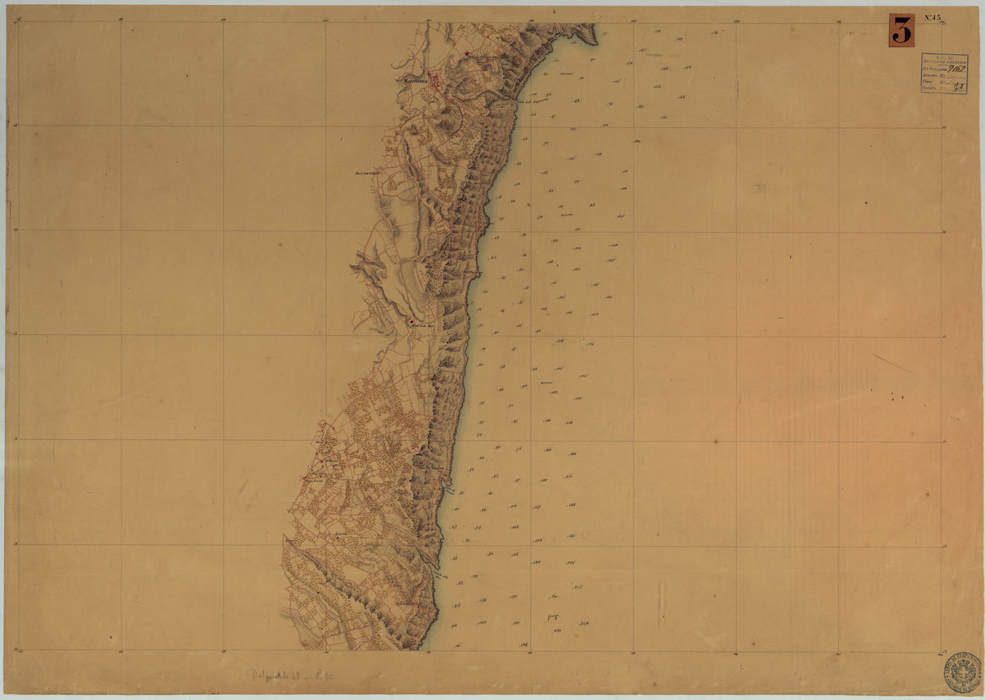 "Sono le levate originali eseguite lungo il litorale adriatico, col concorso dell'idrografo inglese W. Smith, su la base dei rilievi trigonometrici compiuti nel 1817-19 dall'Officio Topografico di Napoli a seguito di quelli già iniziati dagli Ingegneri Geografi del Regno Italico. Sono 44 fogli accuratamente disegnati a penna nello stesso R. Officio Topografico di Napoli. Essi servirono per la "carta di Cabotaggio della Costa del Regno delle Due Sicilie" al 100.000 pubblicata nel 1834. Rappresentano l'orografia con fine tratteggio, abitati e strade in rosso, acque in azzurro, colture e vegetazioni in verde. Gli scandagli sono calcolati in metri e si estendono a 2 Km. dalla costa. La topografia si estende pure per 2 Km. entro terra. Annesso un quadro d'unione. Cfr. Mori A., La Cartografia ufficiale in Italia e l'I.G.M., 1922, pagg. 100-101."