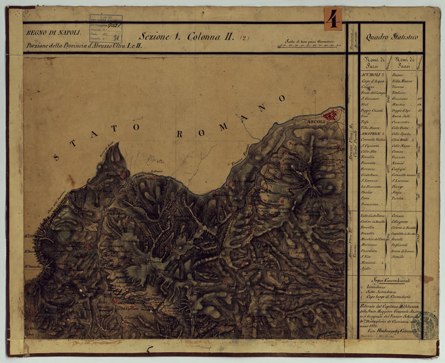 "Disegni originali in 77 fogli montati su tela. Trattasi della revisione della carta di Rizzi Zannoni, eseguita da ufficiali austriaci dell'esercito di occupazione nel Regno di Napoli dopo gli avvenimenti del 1821. La carta rappresenta l'orografia col tratteggio a luce zenitale: distingue gli abitati in base alla loro importanza amministrativa, le stradein postali (ghiaiate, da eseguirsi, naturali), comunali (rotabili,rotabili non in tutti i tempi), sentieri (per cavalli, per pedoni), ponti in pietra, in legno, di battelli, guadi, ecc. Sono distinti a colori vigneti, prati, boschi, oliveti. Sono infine indicati i confini di stato e di provincia. Ciascun foglio reca a destra una colonna con dati statistici e i nomi degli operatori. Annesso un quadro d'unione con la leggenda dei segni convenzionali. Questa carta non venne mai pubblicata: essa tuttavia servì, nel 1868, per la ricostruzione eseguita dagli ufficiali di Stato Maggiore e mappatori dell'Ufficio Tecnico del Corpo di Stato Maggiore: fu allora particolarmente aggiornata la rete stradale. In base a tale ricognizione fu pubblicata nel 1874 la carta fotoincisa in 25 fogli alla scala di 1:250.000 con orografia a tratteggio a luce zenitale di cui al N° 64 d'ordine, Carta delle Provincie Napoletane in fogli 25... (Cart. d'Arch. N° 90, Docum. N° 26). La carta è stata eseguita a partire dal 1822 e anni successivi. Cfr. Mori A., La cartografia ufficiale in Italia e l'I.G.M., 1922, pag.103."