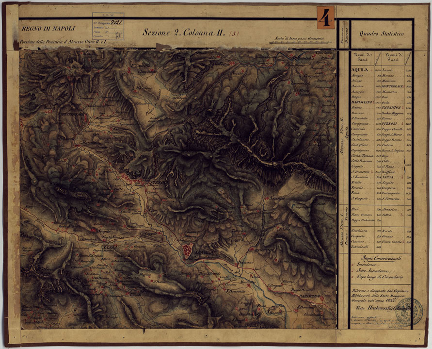 "Disegni originali in 77 fogli montati su tela. Trattasi della revisione della carta di Rizzi Zannoni, eseguita da ufficiali austriaci dell'esercito di occupazione nel Regno di Napoli dopo gli avvenimenti del 1821. La carta rappresenta l'orografia col tratteggio a luce zenitale: distingue gli abitati in base alla loro importanza amministrativa, le stradein postali (ghiaiate, da eseguirsi, naturali), comunali (rotabili,rotabili non in tutti i tempi), sentieri (per cavalli, per pedoni), ponti in pietra, in legno, di battelli, guadi, ecc. Sono distinti a colori vigneti, prati, boschi, oliveti. Sono infine indicati i confini di stato e di provincia. Ciascun foglio reca a destra una colonna con dati statistici e i nomi degli operatori. Annesso un quadro d'unione con la leggenda dei segni convenzionali. Questa carta non venne mai pubblicata: essa tuttavia servì, nel 1868, per la ricostruzione eseguita dagli ufficiali di Stato Maggiore e mappatori dell'Ufficio Tecnico del Corpo di Stato Maggiore: fu allora particolarmente aggiornata la rete stradale. In base a tale ricognizione fu pubblicata nel 1874 la carta fotoincisa in 25 fogli alla scala di 1:250.000 con orografia a tratteggio a luce zenitale di cui al N° 64 d'ordine, Carta delle Provincie Napoletane in fogli 25... (Cart. d'Arch. N° 90, Docum. N° 26). La carta è stata eseguita a partire dal 1822 e anni successivi. Cfr. Mori A., La cartografia ufficiale in Italia e l'I.G.M., 1922, pag.103."
