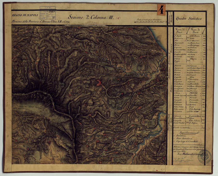 "Disegni originali in 77 fogli montati su tela. Trattasi della revisione della carta di Rizzi Zannoni, eseguita da ufficiali austriaci dell'esercito di occupazione nel Regno di Napoli dopo gli avvenimenti del 1821. La carta rappresenta l'orografia col tratteggio a luce zenitale: distingue gli abitati in base alla loro importanza amministrativa, le stradein postali (ghiaiate, da eseguirsi, naturali), comunali (rotabili,rotabili non in tutti i tempi), sentieri (per cavalli, per pedoni), ponti in pietra, in legno, di battelli, guadi, ecc. Sono distinti a colori vigneti, prati, boschi, oliveti. Sono infine indicati i confini di stato e di provincia. Ciascun foglio reca a destra una colonna con dati statistici e i nomi degli operatori. Annesso un quadro d'unione con la leggenda dei segni convenzionali. Questa carta non venne mai pubblicata: essa tuttavia servì, nel 1868, per la ricostruzione eseguita dagli ufficiali di Stato Maggiore e mappatori dell'Ufficio Tecnico del Corpo di Stato Maggiore: fu allora particolarmente aggiornata la rete stradale. In base a tale ricognizione fu pubblicata nel 1874 la carta fotoincisa in 25 fogli alla scala di 1:250.000 con orografia a tratteggio a luce zenitale di cui al N° 64 d'ordine, Carta delle Provincie Napoletane in fogli 25... (Cart. d'Arch. N° 90, Docum. N° 26). La carta è stata eseguita a partire dal 1822 e anni successivi. Cfr. Mori A., La cartografia ufficiale in Italia e l'I.G.M., 1922, pag.103."