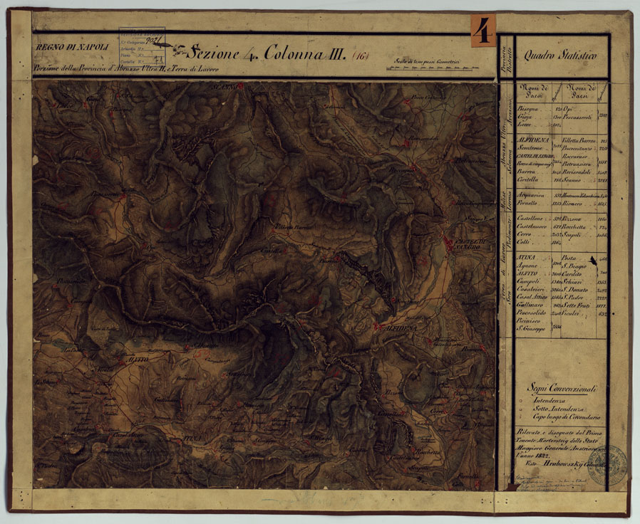 "Disegni originali in 77 fogli montati su tela. Trattasi della revisione della carta di Rizzi Zannoni, eseguita da ufficiali austriaci dell'esercito di occupazione nel Regno di Napoli dopo gli avvenimenti del 1821. La carta rappresenta l'orografia col tratteggio a luce zenitale: distingue gli abitati in base alla loro importanza amministrativa, le stradein postali (ghiaiate, da eseguirsi, naturali), comunali (rotabili,rotabili non in tutti i tempi), sentieri (per cavalli, per pedoni), ponti in pietra, in legno, di battelli, guadi, ecc. Sono distinti a colori vigneti, prati, boschi, oliveti. Sono infine indicati i confini di stato e di provincia. Ciascun foglio reca a destra una colonna con dati statistici e i nomi degli operatori. Annesso un quadro d'unione con la leggenda dei segni convenzionali. Questa carta non venne mai pubblicata: essa tuttavia servì, nel 1868, per la ricostruzione eseguita dagli ufficiali di Stato Maggiore e mappatori dell'Ufficio Tecnico del Corpo di Stato Maggiore: fu allora particolarmente aggiornata la rete stradale. In base a tale ricognizione fu pubblicata nel 1874 la carta fotoincisa in 25 fogli alla scala di 1:250.000 con orografia a tratteggio a luce zenitale di cui al N° 64 d'ordine, Carta delle Provincie Napoletane in fogli 25... (Cart. d'Arch. N° 90, Docum. N° 26). La carta è stata eseguita a partire dal 1822 e anni successivi. Cfr. Mori A., La cartografia ufficiale in Italia e l'I.G.M., 1922, pag.103."