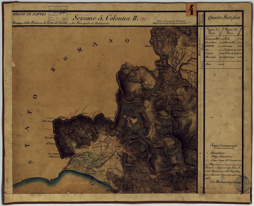 "Disegni originali in 77 fogli montati su tela. Trattasi della revisione della carta di Rizzi Zannoni, eseguita da ufficiali austriaci dell'esercito di occupazione nel Regno di Napoli dopo gli avvenimenti del 1821. La carta rappresenta l'orografia col tratteggio a luce zenitale: distingue gli abitati in base alla loro importanza amministrativa, le stradein postali (ghiaiate, da eseguirsi, naturali), comunali (rotabili,rotabili non in tutti i tempi), sentieri (per cavalli, per pedoni), ponti in pietra, in legno, di battelli, guadi, ecc. Sono distinti a colori vigneti, prati, boschi, oliveti. Sono infine indicati i confini di stato e di provincia. Ciascun foglio reca a destra una colonna con dati statistici e i nomi degli operatori. Annesso un quadro d'unione con la leggenda dei segni convenzionali. Questa carta non venne mai pubblicata: essa tuttavia servì, nel 1868, per la ricostruzione eseguita dagli ufficiali di Stato Maggiore e mappatori dell'Ufficio Tecnico del Corpo di Stato Maggiore: fu allora particolarmente aggiornata la rete stradale. In base a tale ricognizione fu pubblicata nel 1874 la carta fotoincisa in 25 fogli alla scala di 1:250.000 con orografia a tratteggio a luce zenitale di cui al N° 64 d'ordine, Carta delle Provincie Napoletane in fogli 25... (Cart. d'Arch. N° 90, Docum. N° 26). La carta è stata eseguita a partire dal 1822 e anni successivi. Cfr. Mori A., La cartografia ufficiale in Italia e l'I.G.M., 1922, pag.103."