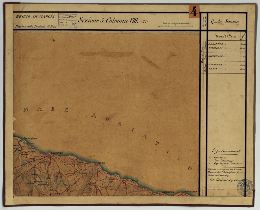 "Disegni originali in 77 fogli montati su tela. Trattasi della revisione della carta di Rizzi Zannoni, eseguita da ufficiali austriaci dell'esercito di occupazione nel Regno di Napoli dopo gli avvenimenti del 1821. La carta rappresenta l'orografia col tratteggio a luce zenitale: distingue gli abitati in base alla loro importanza amministrativa, le stradein postali (ghiaiate, da eseguirsi, naturali), comunali (rotabili,rotabili non in tutti i tempi), sentieri (per cavalli, per pedoni), ponti in pietra, in legno, di battelli, guadi, ecc. Sono distinti a colori vigneti, prati, boschi, oliveti. Sono infine indicati i confini di stato e di provincia. Ciascun foglio reca a destra una colonna con dati statistici e i nomi degli operatori. Annesso un quadro d'unione con la leggenda dei segni convenzionali. Questa carta non venne mai pubblicata: essa tuttavia servì, nel 1868, per la ricostruzione eseguita dagli ufficiali di Stato Maggiore e mappatori dell'Ufficio Tecnico del Corpo di Stato Maggiore: fu allora particolarmente aggiornata la rete stradale. In base a tale ricognizione fu pubblicata nel 1874 la carta fotoincisa in 25 fogli alla scala di 1:250.000 con orografia a tratteggio a luce zenitale di cui al N° 64 d'ordine, Carta delle Provincie Napoletane in fogli 25... (Cart. d'Arch. N° 90, Docum. N° 26). La carta è stata eseguita a partire dal 1822 e anni successivi. Cfr. Mori A., La cartografia ufficiale in Italia e l'I.G.M., 1922, pag.103."