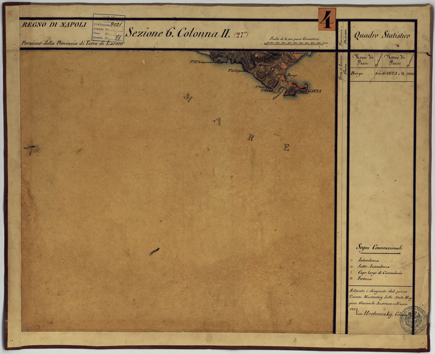 "Disegni originali in 77 fogli montati su tela. Trattasi della revisione della carta di Rizzi Zannoni, eseguita da ufficiali austriaci dell'esercito di occupazione nel Regno di Napoli dopo gli avvenimenti del 1821. La carta rappresenta l'orografia col tratteggio a luce zenitale: distingue gli abitati in base alla loro importanza amministrativa, le stradein postali (ghiaiate, da eseguirsi, naturali), comunali (rotabili,rotabili non in tutti i tempi), sentieri (per cavalli, per pedoni), ponti in pietra, in legno, di battelli, guadi, ecc. Sono distinti a colori vigneti, prati, boschi, oliveti. Sono infine indicati i confini di stato e di provincia. Ciascun foglio reca a destra una colonna con dati statistici e i nomi degli operatori. Annesso un quadro d'unione con la leggenda dei segni convenzionali. Questa carta non venne mai pubblicata: essa tuttavia servì, nel 1868, per la ricostruzione eseguita dagli ufficiali di Stato Maggiore e mappatori dell'Ufficio Tecnico del Corpo di Stato Maggiore: fu allora particolarmente aggiornata la rete stradale. In base a tale ricognizione fu pubblicata nel 1874 la carta fotoincisa in 25 fogli alla scala di 1:250.000 con orografia a tratteggio a luce zenitale di cui al N° 64 d'ordine, Carta delle Provincie Napoletane in fogli 25... (Cart. d'Arch. N° 90, Docum. N° 26). La carta è stata eseguita a partire dal 1822 e anni successivi. Cfr. Mori A., La cartografia ufficiale in Italia e l'I.G.M., 1922, pag.103."