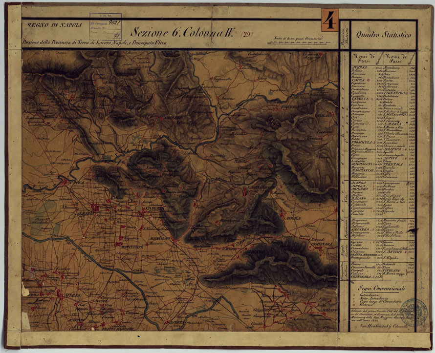 "Disegni originali in 77 fogli montati su tela. Trattasi della revisione della carta di Rizzi Zannoni, eseguita da ufficiali austriaci dell'esercito di occupazione nel Regno di Napoli dopo gli avvenimenti del 1821. La carta rappresenta l'orografia col tratteggio a luce zenitale: distingue gli abitati in base alla loro importanza amministrativa, le stradein postali (ghiaiate, da eseguirsi, naturali), comunali (rotabili,rotabili non in tutti i tempi), sentieri (per cavalli, per pedoni), ponti in pietra, in legno, di battelli, guadi, ecc. Sono distinti a colori vigneti, prati, boschi, oliveti. Sono infine indicati i confini di stato e di provincia. Ciascun foglio reca a destra una colonna con dati statistici e i nomi degli operatori. Annesso un quadro d'unione con la leggenda dei segni convenzionali. Questa carta non venne mai pubblicata: essa tuttavia servì, nel 1868, per la ricostruzione eseguita dagli ufficiali di Stato Maggiore e mappatori dell'Ufficio Tecnico del Corpo di Stato Maggiore: fu allora particolarmente aggiornata la rete stradale. In base a tale ricognizione fu pubblicata nel 1874 la carta fotoincisa in 25 fogli alla scala di 1:250.000 con orografia a tratteggio a luce zenitale di cui al N° 64 d'ordine, Carta delle Provincie Napoletane in fogli 25... (Cart. d'Arch. N° 90, Docum. N° 26). La carta è stata eseguita a partire dal 1822 e anni successivi. Cfr. Mori A., La cartografia ufficiale in Italia e l'I.G.M., 1922, pag.103."