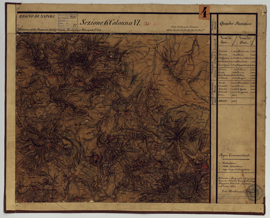 "Disegni originali in 77 fogli montati su tela. Trattasi della revisione della carta di Rizzi Zannoni, eseguita da ufficiali austriaci dell'esercito di occupazione nel Regno di Napoli dopo gli avvenimenti del 1821. La carta rappresenta l'orografia col tratteggio a luce zenitale: distingue gli abitati in base alla loro importanza amministrativa, le stradein postali (ghiaiate, da eseguirsi, naturali), comunali (rotabili,rotabili non in tutti i tempi), sentieri (per cavalli, per pedoni), ponti in pietra, in legno, di battelli, guadi, ecc. Sono distinti a colori vigneti, prati, boschi, oliveti. Sono infine indicati i confini di stato e di provincia. Ciascun foglio reca a destra una colonna con dati statistici e i nomi degli operatori. Annesso un quadro d'unione con la leggenda dei segni convenzionali. Questa carta non venne mai pubblicata: essa tuttavia servì, nel 1868, per la ricostruzione eseguita dagli ufficiali di Stato Maggiore e mappatori dell'Ufficio Tecnico del Corpo di Stato Maggiore: fu allora particolarmente aggiornata la rete stradale. In base a tale ricognizione fu pubblicata nel 1874 la carta fotoincisa in 25 fogli alla scala di 1:250.000 con orografia a tratteggio a luce zenitale di cui al N° 64 d'ordine, Carta delle Provincie Napoletane in fogli 25... (Cart. d'Arch. N° 90, Docum. N° 26). La carta è stata eseguita a partire dal 1822 e anni successivi. Cfr. Mori A., La cartografia ufficiale in Italia e l'I.G.M., 1922, pag.103."