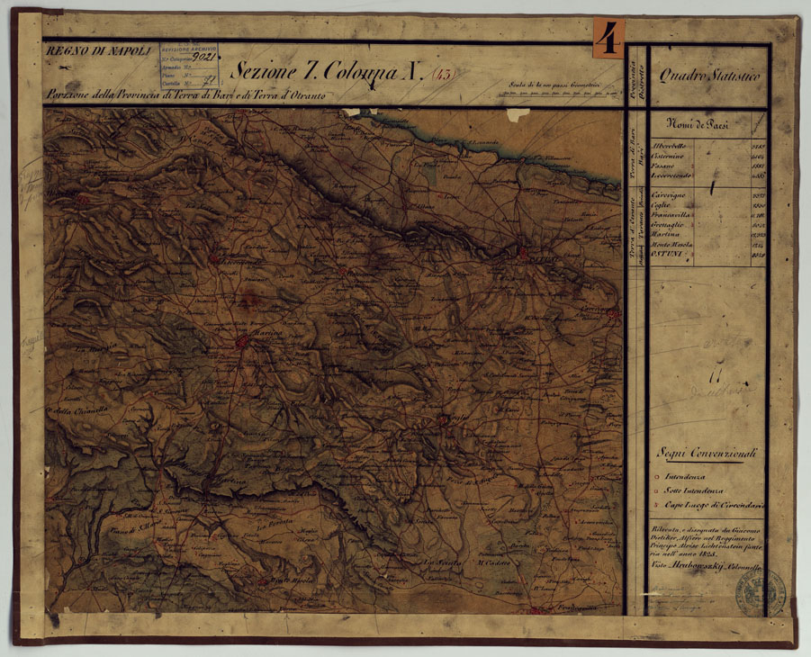 "Disegni originali in 77 fogli montati su tela. Trattasi della revisione della carta di Rizzi Zannoni, eseguita da ufficiali austriaci dell'esercito di occupazione nel Regno di Napoli dopo gli avvenimenti del 1821. La carta rappresenta l'orografia col tratteggio a luce zenitale: distingue gli abitati in base alla loro importanza amministrativa, le stradein postali (ghiaiate, da eseguirsi, naturali), comunali (rotabili,rotabili non in tutti i tempi), sentieri (per cavalli, per pedoni), ponti in pietra, in legno, di battelli, guadi, ecc. Sono distinti a colori vigneti, prati, boschi, oliveti. Sono infine indicati i confini di stato e di provincia. Ciascun foglio reca a destra una colonna con dati statistici e i nomi degli operatori. Annesso un quadro d'unione con la leggenda dei segni convenzionali. Questa carta non venne mai pubblicata: essa tuttavia servì, nel 1868, per la ricostruzione eseguita dagli ufficiali di Stato Maggiore e mappatori dell'Ufficio Tecnico del Corpo di Stato Maggiore: fu allora particolarmente aggiornata la rete stradale. In base a tale ricognizione fu pubblicata nel 1874 la carta fotoincisa in 25 fogli alla scala di 1:250.000 con orografia a tratteggio a luce zenitale di cui al N° 64 d'ordine, Carta delle Provincie Napoletane in fogli 25... (Cart. d'Arch. N° 90, Docum. N° 26). La carta è stata eseguita a partire dal 1822 e anni successivi. Cfr. Mori A., La cartografia ufficiale in Italia e l'I.G.M., 1922, pag.103."