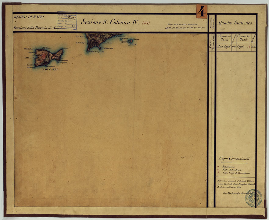 "Disegni originali in 77 fogli montati su tela. Trattasi della revisione della carta di Rizzi Zannoni, eseguita da ufficiali austriaci dell'esercito di occupazione nel Regno di Napoli dopo gli avvenimenti del 1821. La carta rappresenta l'orografia col tratteggio a luce zenitale: distingue gli abitati in base alla loro importanza amministrativa, le stradein postali (ghiaiate, da eseguirsi, naturali), comunali (rotabili,rotabili non in tutti i tempi), sentieri (per cavalli, per pedoni), ponti in pietra, in legno, di battelli, guadi, ecc. Sono distinti a colori vigneti, prati, boschi, oliveti. Sono infine indicati i confini di stato e di provincia. Ciascun foglio reca a destra una colonna con dati statistici e i nomi degli operatori. Annesso un quadro d'unione con la leggenda dei segni convenzionali. Questa carta non venne mai pubblicata: essa tuttavia servì, nel 1868, per la ricostruzione eseguita dagli ufficiali di Stato Maggiore e mappatori dell'Ufficio Tecnico del Corpo di Stato Maggiore: fu allora particolarmente aggiornata la rete stradale. In base a tale ricognizione fu pubblicata nel 1874 la carta fotoincisa in 25 fogli alla scala di 1:250.000 con orografia a tratteggio a luce zenitale di cui al N° 64 d'ordine, Carta delle Provincie Napoletane in fogli 25... (Cart. d'Arch. N° 90, Docum. N° 26). La carta è stata eseguita a partire dal 1822 e anni successivi. Cfr. Mori A., La cartografia ufficiale in Italia e l'I.G.M., 1922, pag.103."