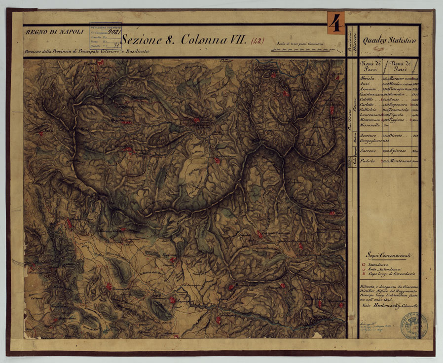"Disegni originali in 77 fogli montati su tela. Trattasi della revisione della carta di Rizzi Zannoni, eseguita da ufficiali austriaci dell'esercito di occupazione nel Regno di Napoli dopo gli avvenimenti del 1821. La carta rappresenta l'orografia col tratteggio a luce zenitale: distingue gli abitati in base alla loro importanza amministrativa, le stradein postali (ghiaiate, da eseguirsi, naturali), comunali (rotabili,rotabili non in tutti i tempi), sentieri (per cavalli, per pedoni), ponti in pietra, in legno, di battelli, guadi, ecc. Sono distinti a colori vigneti, prati, boschi, oliveti. Sono infine indicati i confini di stato e di provincia. Ciascun foglio reca a destra una colonna con dati statistici e i nomi degli operatori. Annesso un quadro d'unione con la leggenda dei segni convenzionali. Questa carta non venne mai pubblicata: essa tuttavia servì, nel 1868, per la ricostruzione eseguita dagli ufficiali di Stato Maggiore e mappatori dell'Ufficio Tecnico del Corpo di Stato Maggiore: fu allora particolarmente aggiornata la rete stradale. In base a tale ricognizione fu pubblicata nel 1874 la carta fotoincisa in 25 fogli alla scala di 1:250.000 con orografia a tratteggio a luce zenitale di cui al N° 64 d'ordine, Carta delle Provincie Napoletane in fogli 25... (Cart. d'Arch. N° 90, Docum. N° 26). La carta è stata eseguita a partire dal 1822 e anni successivi. Cfr. Mori A., La cartografia ufficiale in Italia e l'I.G.M., 1922, pag.103."