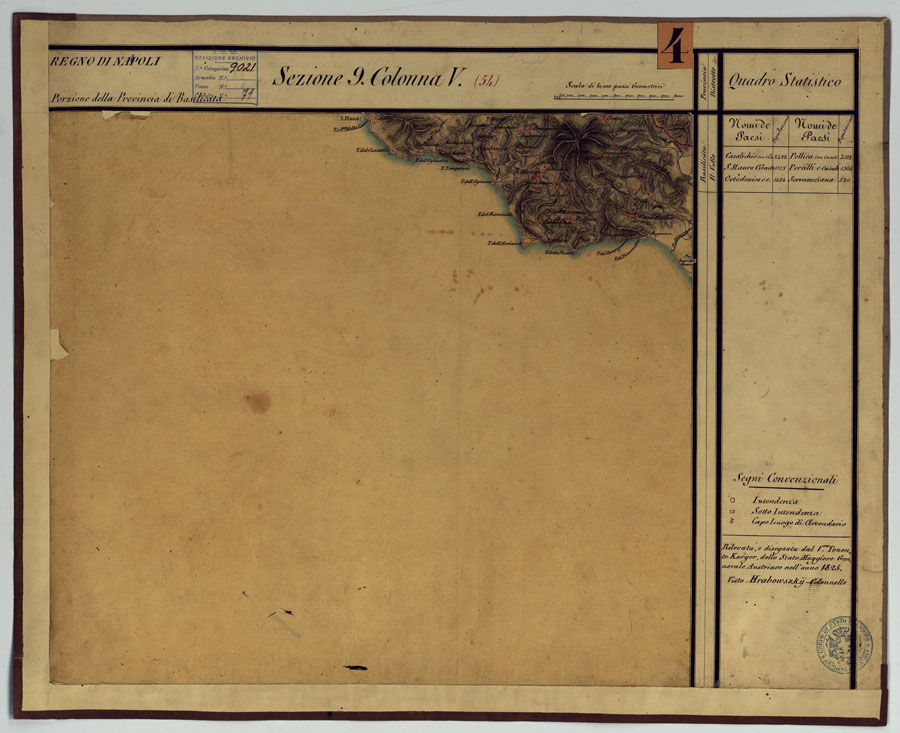 "Disegni originali in 77 fogli montati su tela. Trattasi della revisione della carta di Rizzi Zannoni, eseguita da ufficiali austriaci dell'esercito di occupazione nel Regno di Napoli dopo gli avvenimenti del 1821. La carta rappresenta l'orografia col tratteggio a luce zenitale: distingue gli abitati in base alla loro importanza amministrativa, le stradein postali (ghiaiate, da eseguirsi, naturali), comunali (rotabili,rotabili non in tutti i tempi), sentieri (per cavalli, per pedoni), ponti in pietra, in legno, di battelli, guadi, ecc. Sono distinti a colori vigneti, prati, boschi, oliveti. Sono infine indicati i confini di stato e di provincia. Ciascun foglio reca a destra una colonna con dati statistici e i nomi degli operatori. Annesso un quadro d'unione con la leggenda dei segni convenzionali. Questa carta non venne mai pubblicata: essa tuttavia servì, nel 1868, per la ricostruzione eseguita dagli ufficiali di Stato Maggiore e mappatori dell'Ufficio Tecnico del Corpo di Stato Maggiore: fu allora particolarmente aggiornata la rete stradale. In base a tale ricognizione fu pubblicata nel 1874 la carta fotoincisa in 25 fogli alla scala di 1:250.000 con orografia a tratteggio a luce zenitale di cui al N° 64 d'ordine, Carta delle Provincie Napoletane in fogli 25... (Cart. d'Arch. N° 90, Docum. N° 26). La carta è stata eseguita a partire dal 1822 e anni successivi. Cfr. Mori A., La cartografia ufficiale in Italia e l'I.G.M., 1922, pag.103."