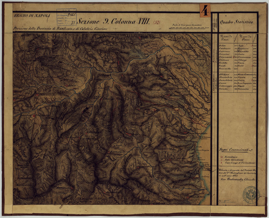 "Disegni originali in 77 fogli montati su tela. Trattasi della revisione della carta di Rizzi Zannoni, eseguita da ufficiali austriaci dell'esercito di occupazione nel Regno di Napoli dopo gli avvenimenti del 1821. La carta rappresenta l'orografia col tratteggio a luce zenitale: distingue gli abitati in base alla loro importanza amministrativa, le stradein postali (ghiaiate, da eseguirsi, naturali), comunali (rotabili,rotabili non in tutti i tempi), sentieri (per cavalli, per pedoni), ponti in pietra, in legno, di battelli, guadi, ecc. Sono distinti a colori vigneti, prati, boschi, oliveti. Sono infine indicati i confini di stato e di provincia. Ciascun foglio reca a destra una colonna con dati statistici e i nomi degli operatori. Annesso un quadro d'unione con la leggenda dei segni convenzionali. Questa carta non venne mai pubblicata: essa tuttavia servì, nel 1868, per la ricostruzione eseguita dagli ufficiali di Stato Maggiore e mappatori dell'Ufficio Tecnico del Corpo di Stato Maggiore: fu allora particolarmente aggiornata la rete stradale. In base a tale ricognizione fu pubblicata nel 1874 la carta fotoincisa in 25 fogli alla scala di 1:250.000 con orografia a tratteggio a luce zenitale di cui al N° 64 d'ordine, Carta delle Provincie Napoletane in fogli 25... (Cart. d'Arch. N° 90, Docum. N° 26). La carta è stata eseguita a partire dal 1822 e anni successivi. Cfr. Mori A., La cartografia ufficiale in Italia e l'I.G.M., 1922, pag.103."