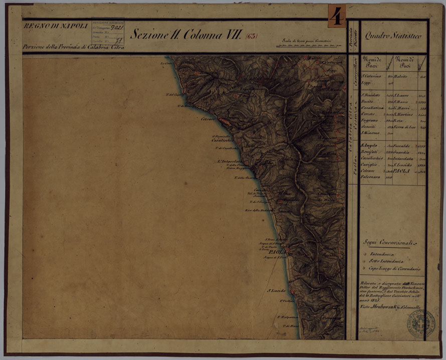"Disegni originali in 77 fogli montati su tela. Trattasi della revisione della carta di Rizzi Zannoni, eseguita da ufficiali austriaci dell'esercito di occupazione nel Regno di Napoli dopo gli avvenimenti del 1821. La carta rappresenta l'orografia col tratteggio a luce zenitale: distingue gli abitati in base alla loro importanza amministrativa, le stradein postali (ghiaiate, da eseguirsi, naturali), comunali (rotabili,rotabili non in tutti i tempi), sentieri (per cavalli, per pedoni), ponti in pietra, in legno, di battelli, guadi, ecc. Sono distinti a colori vigneti, prati, boschi, oliveti. Sono infine indicati i confini di stato e di provincia. Ciascun foglio reca a destra una colonna con dati statistici e i nomi degli operatori. Annesso un quadro d'unione con la leggenda dei segni convenzionali. Questa carta non venne mai pubblicata: essa tuttavia servì, nel 1868, per la ricostruzione eseguita dagli ufficiali di Stato Maggiore e mappatori dell'Ufficio Tecnico del Corpo di Stato Maggiore: fu allora particolarmente aggiornata la rete stradale. In base a tale ricognizione fu pubblicata nel 1874 la carta fotoincisa in 25 fogli alla scala di 1:250.000 con orografia a tratteggio a luce zenitale di cui al N° 64 d'ordine, Carta delle Provincie Napoletane in fogli 25... (Cart. d'Arch. N° 90, Docum. N° 26). La carta è stata eseguita a partire dal 1822 e anni successivi. Cfr. Mori A., La cartografia ufficiale in Italia e l'I.G.M., 1922, pag.103."
