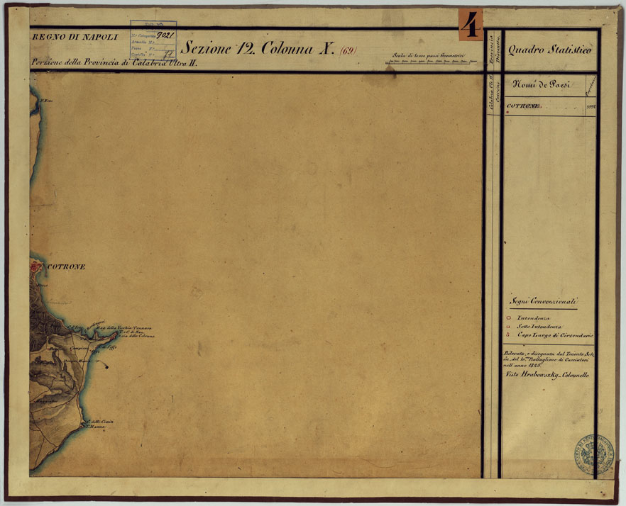 "Disegni originali in 77 fogli montati su tela. Trattasi della revisione della carta di Rizzi Zannoni, eseguita da ufficiali austriaci dell'esercito di occupazione nel Regno di Napoli dopo gli avvenimenti del 1821. La carta rappresenta l'orografia col tratteggio a luce zenitale: distingue gli abitati in base alla loro importanza amministrativa, le stradein postali (ghiaiate, da eseguirsi, naturali), comunali (rotabili,rotabili non in tutti i tempi), sentieri (per cavalli, per pedoni), ponti in pietra, in legno, di battelli, guadi, ecc. Sono distinti a colori vigneti, prati, boschi, oliveti. Sono infine indicati i confini di stato e di provincia. Ciascun foglio reca a destra una colonna con dati statistici e i nomi degli operatori. Annesso un quadro d'unione con la leggenda dei segni convenzionali. Questa carta non venne mai pubblicata: essa tuttavia servì, nel 1868, per la ricostruzione eseguita dagli ufficiali di Stato Maggiore e mappatori dell'Ufficio Tecnico del Corpo di Stato Maggiore: fu allora particolarmente aggiornata la rete stradale. In base a tale ricognizione fu pubblicata nel 1874 la carta fotoincisa in 25 fogli alla scala di 1:250.000 con orografia a tratteggio a luce zenitale di cui al N° 64 d'ordine, Carta delle Provincie Napoletane in fogli 25... (Cart. d'Arch. N° 90, Docum. N° 26). La carta è stata eseguita a partire dal 1822 e anni successivi. Cfr. Mori A., La cartografia ufficiale in Italia e l'I.G.M., 1922, pag.103."