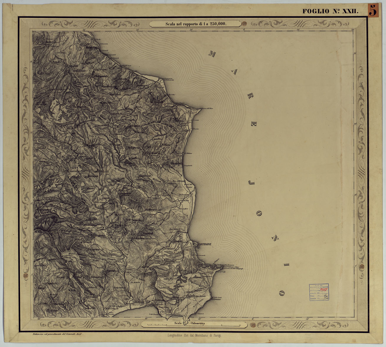 CARTA DELLE PROVINCIE NAPOLETANE IN 25 FOGLI COL PROCEDIMENTO DEL GENERALE AVET ALLA SCALA DI 1 250.000 PUBBLICATA DALL'ISTITUTO TOPOGRAFICO MILITARE 1874 - FOGLIO XXII.