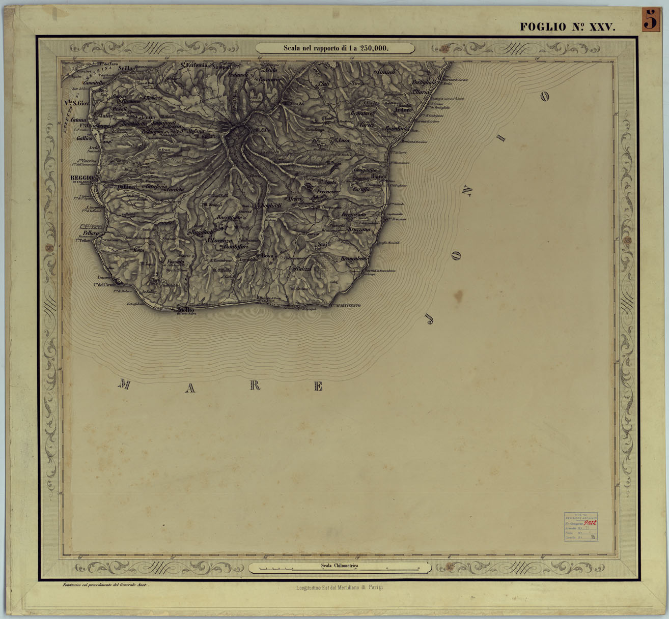 "Venticinque fogli modello per la carta al 250.000 (corrispondente ai numeri 39 d'ordine - Cart. d'Arch. 71 - Doc. 9021d'ordine - Cart. d'Arch. 90 - Doc. 26 da riprodursi in fotoincisione secondo il procedimento Avet. Ciascun foglio reca il nome degli operatori (cfr. Mori A., La cartografia ufficiale in Italia e l'I.G.M., 1922)."