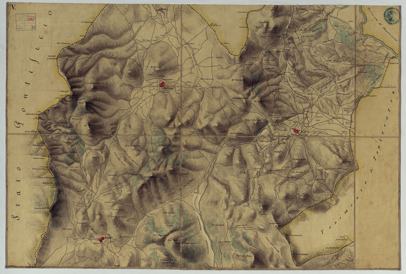 "Bella carta disegnata in 35 fogli montati su tela a stacchi. Orografia rappresentata con lo sfumo a luce obliqua acque in azzurro abitati in rosso zone boschive in verde confine politico in giallo. Annesso un quadro d'unione riferito alla numerazione dei fogli da 35 a 8. Per i fogli con numerazione da 7 a 1 il quadro di riferimento è nel foglio 1. Il quadro d'unione di riferimento a questo foglio è contenuto nel Foglio I per agevolare la ricerca, la numerazione dei fogli contenuta nel titolo è riferita al quadro d'unione corrispondente e non al numero riportato sulla carta. La data è supposta."