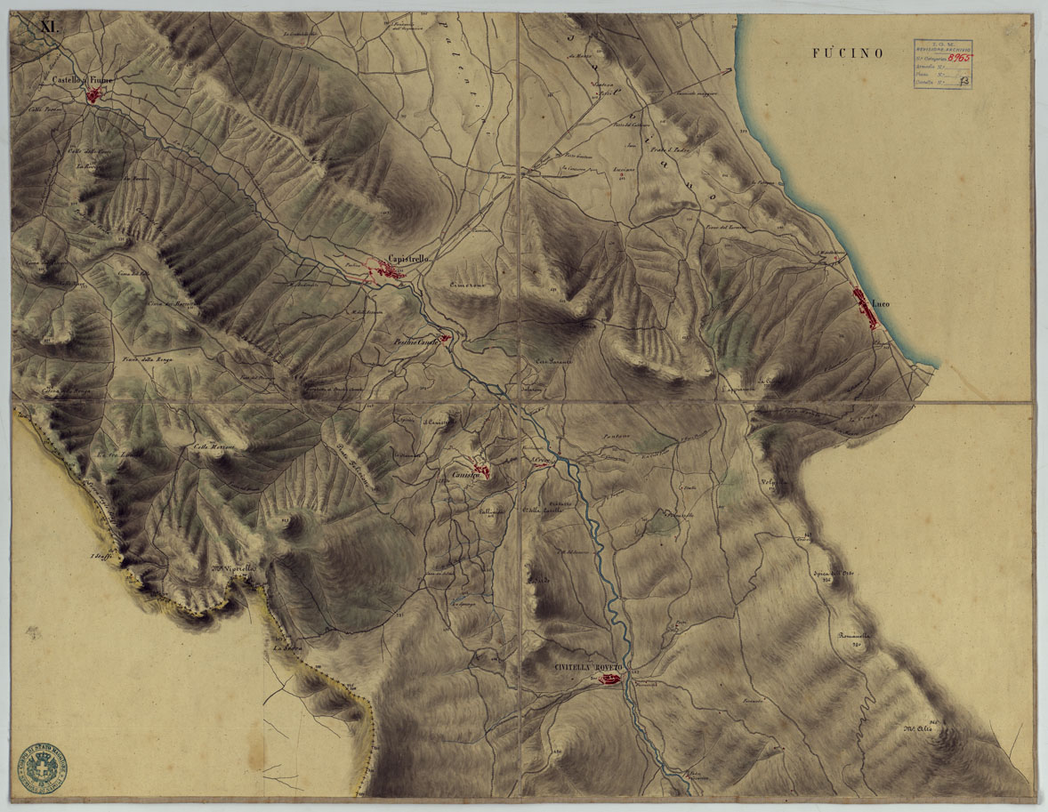 "Bella carta disegnata in 35 fogli montati su tela a stacchi. Orografia rappresentata con lo sfumo a luce obliqua acque in azzurro abitati in rosso zone boschive in verde confine politico in giallo. Annesso un quadro d'unione riferito alla numerazione dei fogli da 35 a 8. Per i fogli con numerazione da 7 a 1 il quadro di riferimento è nel foglio 1. Il quadro d'unione di riferimento a questo foglio è contenuto nel Foglio I per agevolare la ricerca, la numerazione dei fogli contenuta nel titolo è riferita al quadro d'unione corrispondente e non al numero riportato sulla carta. La data è supposta."