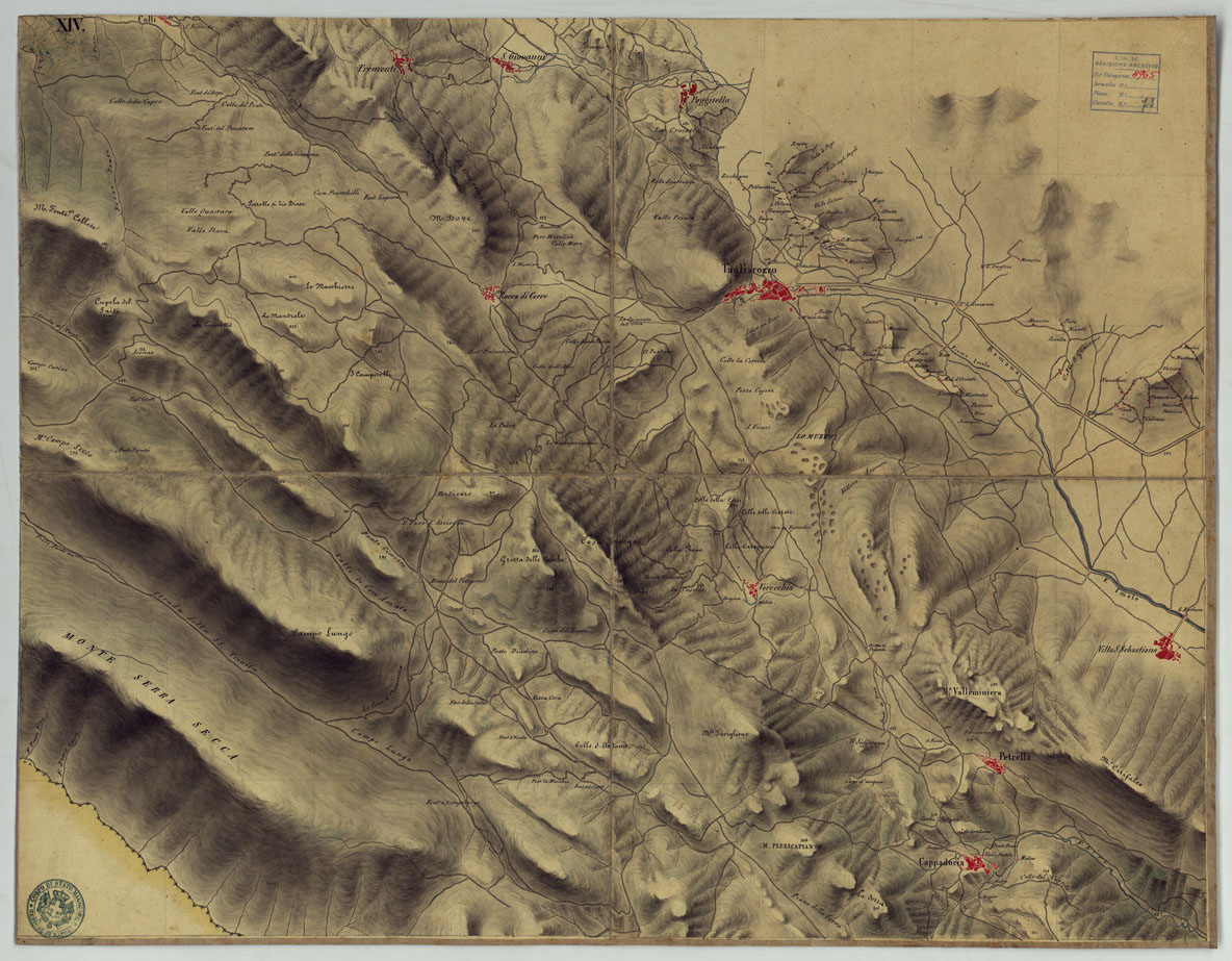 "Bella carta disegnata in 35 fogli montati su tela a stacchi. Orografia rappresentata con lo sfumo a luce obliqua acque in azzurro abitati in rosso zone boschive in verde confine politico in giallo. Annesso un quadro d'unione riferito alla numerazione dei fogli da 35 a 8. Per i fogli con numerazione da 7 a 1 il quadro di riferimento è nel foglio 1. Il quadro d'unione di riferimento a questo foglio è contenuto nel Foglio I per agevolare la ricerca, la numerazione dei fogli contenuta nel titolo è riferita al quadro d'unione corrispondente e non al numero riportato sulla carta. La data è supposta."