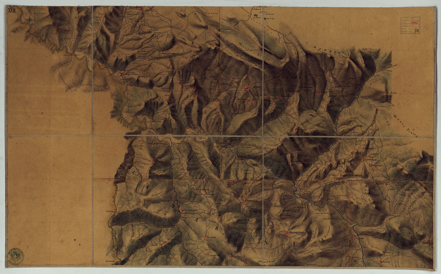"Bella carta disegnata in 35 fogli montati su tela a stacchi. Orografia rappresentata con lo sfumo a luce obliqua acque in azzurro abitati in rosso zone boschive in verde confine politico in giallo. Annesso un quadro d'unione riferito alla numerazione dei fogli da 35 a 8. Per i fogli con numerazione da 7 a 1 il quadro di riferimento è nel foglio 1. Il quadro d'unione di riferimento a questo foglio è contenuto nel Foglio I per agevolare la ricerca, la numerazione dei fogli contenuta nel titolo è riferita al quadro d'unione corrispondente e non al numero riportato sulla carta. La data è supposta."