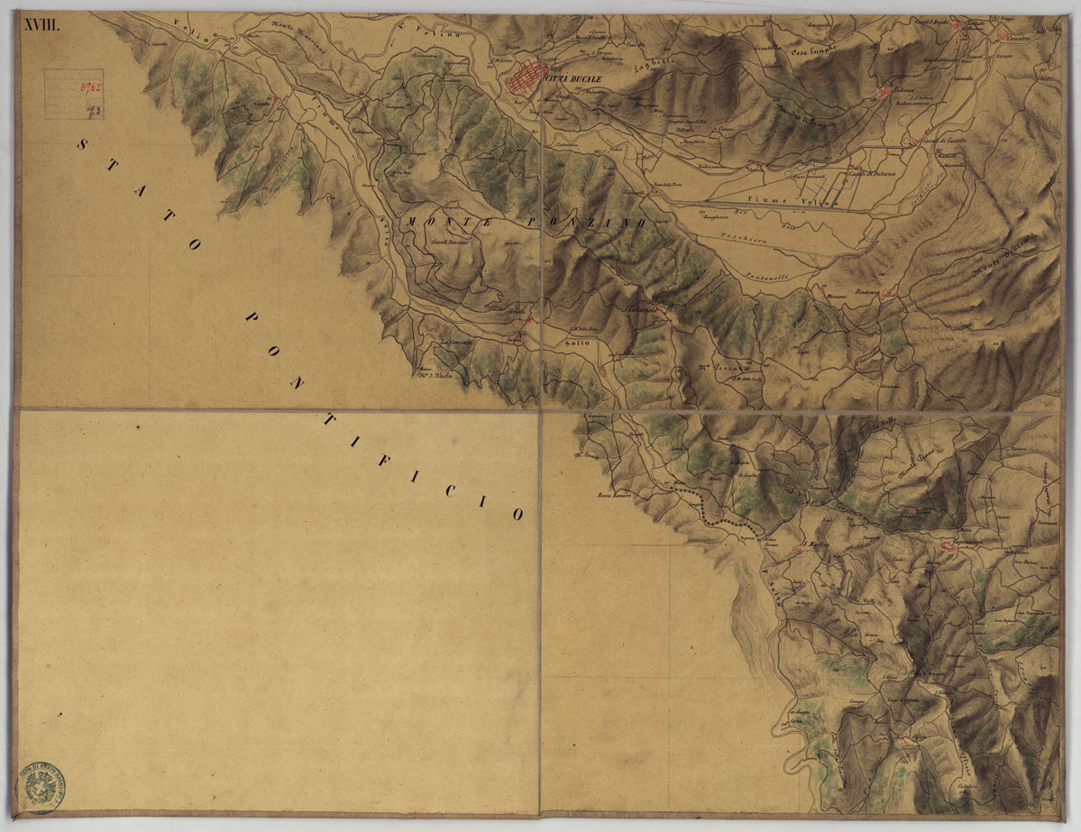 "Bella carta disegnata in 35 fogli montati su tela a stacchi. Orografia rappresentata con lo sfumo a luce obliqua acque in azzurro abitati in rosso zone boschive in verde confine politico in giallo. Annesso un quadro d'unione riferito alla numerazione dei fogli da 35 a 8. Per i fogli con numerazione da 7 a 1 il quadro di riferimento è nel foglio 1. Il quadro d'unione di riferimento a questo foglio è contenuto nel Foglio I per agevolare la ricerca, la numerazione dei fogli contenuta nel titolo è riferita al quadro d'unione corrispondente e non al numero riportato sulla carta. La data è supposta."