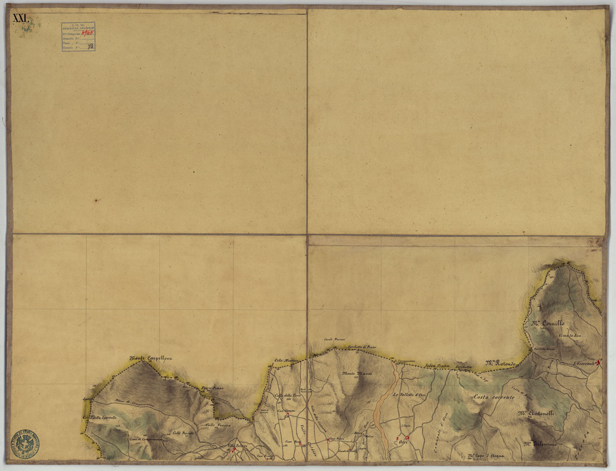 "Bella carta disegnata in 35 fogli montati su tela a stacchi. Orografia rappresentata con lo sfumo a luce obliqua acque in azzurro abitati in rosso zone boschive in verde confine politico in giallo. Annesso un quadro d'unione riferito alla numerazione dei fogli da 35 a 8. Per i fogli con numerazione da 7 a 1 il quadro di riferimento è nel foglio 1. Il quadro d'unione di riferimento a questo foglio è contenuto nel Foglio I per agevolare la ricerca, la numerazione dei fogli contenuta nel titolo è riferita al quadro d'unione corrispondente e non al numero riportato sulla carta. La data è supposta."