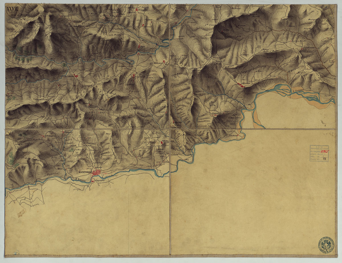 "Bella carta disegnata in 35 fogli montati su tela a stacchi. Orografia rappresentata con lo sfumo a luce obliqua acque in azzurro abitati in rosso zone boschive in verde confine politico in giallo. Annesso un quadro d'unione riferito alla numerazione dei fogli da 35 a 8. Per i fogli con numerazione da 7 a 1 il quadro di riferimento è nel foglio 1. Il quadro d'unione di riferimento a questo foglio è contenuto nel Foglio I per agevolare la ricerca, la numerazione dei fogli contenuta nel titolo è riferita al quadro d'unione corrispondente e non al numero riportato sulla carta. La data è supposta."
