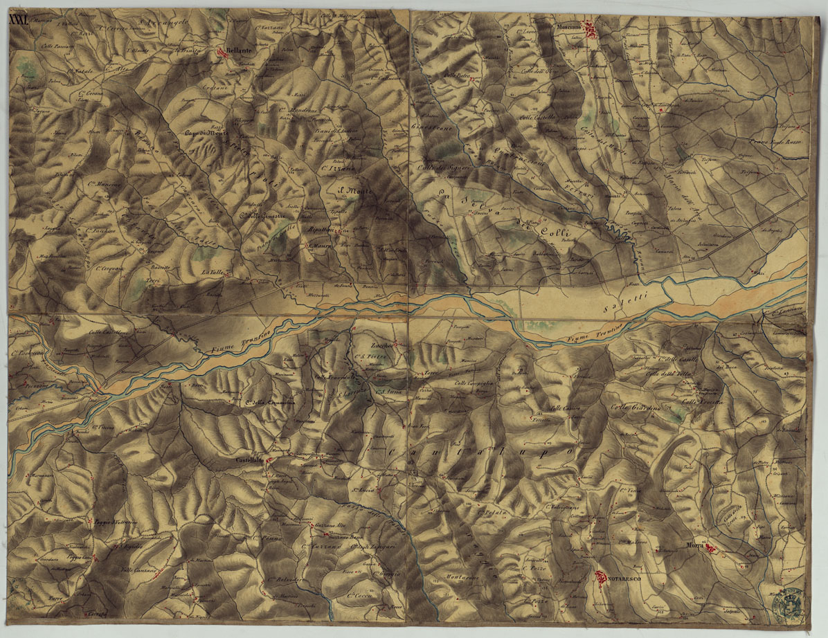 "Bella carta disegnata in 35 fogli montati su tela a stacchi. Orografia rappresentata con lo sfumo a luce obliqua acque in azzurro abitati in rosso zone boschive in verde confine politico in giallo. Annesso un quadro d'unione riferito alla numerazione dei fogli da 35 a 8. Per i fogli con numerazione da 7 a 1 il quadro di riferimento è nel foglio 1. Il quadro d'unione di riferimento a questo foglio è contenuto nel Foglio I per agevolare la ricerca, la numerazione dei fogli contenuta nel titolo è riferita al quadro d'unione corrispondente e non al numero riportato sulla carta. La data è supposta."