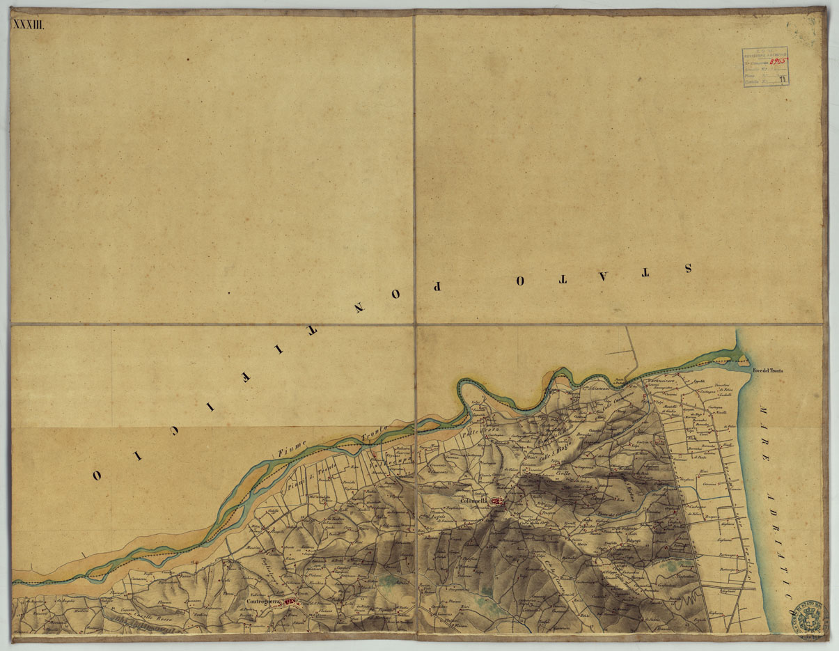 "Bella carta disegnata in 35 fogli montati su tela a stacchi. Orografia rappresentata con lo sfumo a luce obliqua acque in azzurro abitati in rosso zone boschive in verde confine politico in giallo. Annesso un quadro d'unione riferito alla numerazione dei fogli da 35 a 8. Per i fogli con numerazione da 7 a 1 il quadro di riferimento è nel foglio 1. Il quadro d'unione di riferimento a questo foglio è contenuto nel Foglio I per agevolare la ricerca, la numerazione dei fogli contenuta nel titolo è riferita al quadro d'unione corrispondente e non al numero riportato sulla carta. La data è supposta."