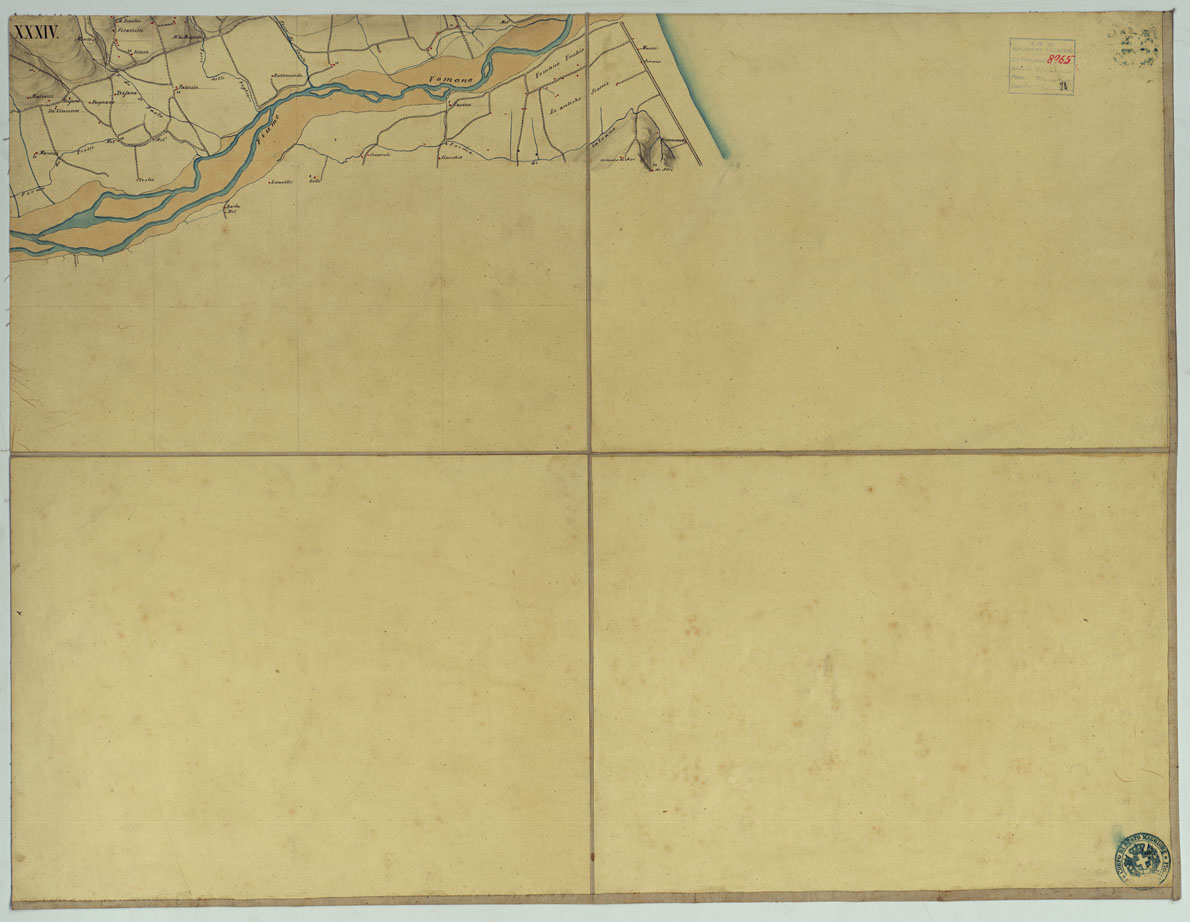 "Bella carta disegnata in 35 fogli montati su tela a stacchi. Orografia rappresentata con lo sfumo a luce obliqua acque in azzurro abitati in rosso zone boschive in verde confine politico in giallo. Annesso un quadro d'unione riferito alla numerazione dei fogli da 35 a 8. Per i fogli con numerazione da 7 a 1 il quadro di riferimento è nel foglio 1. Il quadro d'unione di riferimento a questo foglio è contenuto nel Foglio I per agevolare la ricerca, la numerazione dei fogli contenuta nel titolo è riferita al quadro d'unione corrispondente e non al numero riportato sulla carta. La data è supposta."