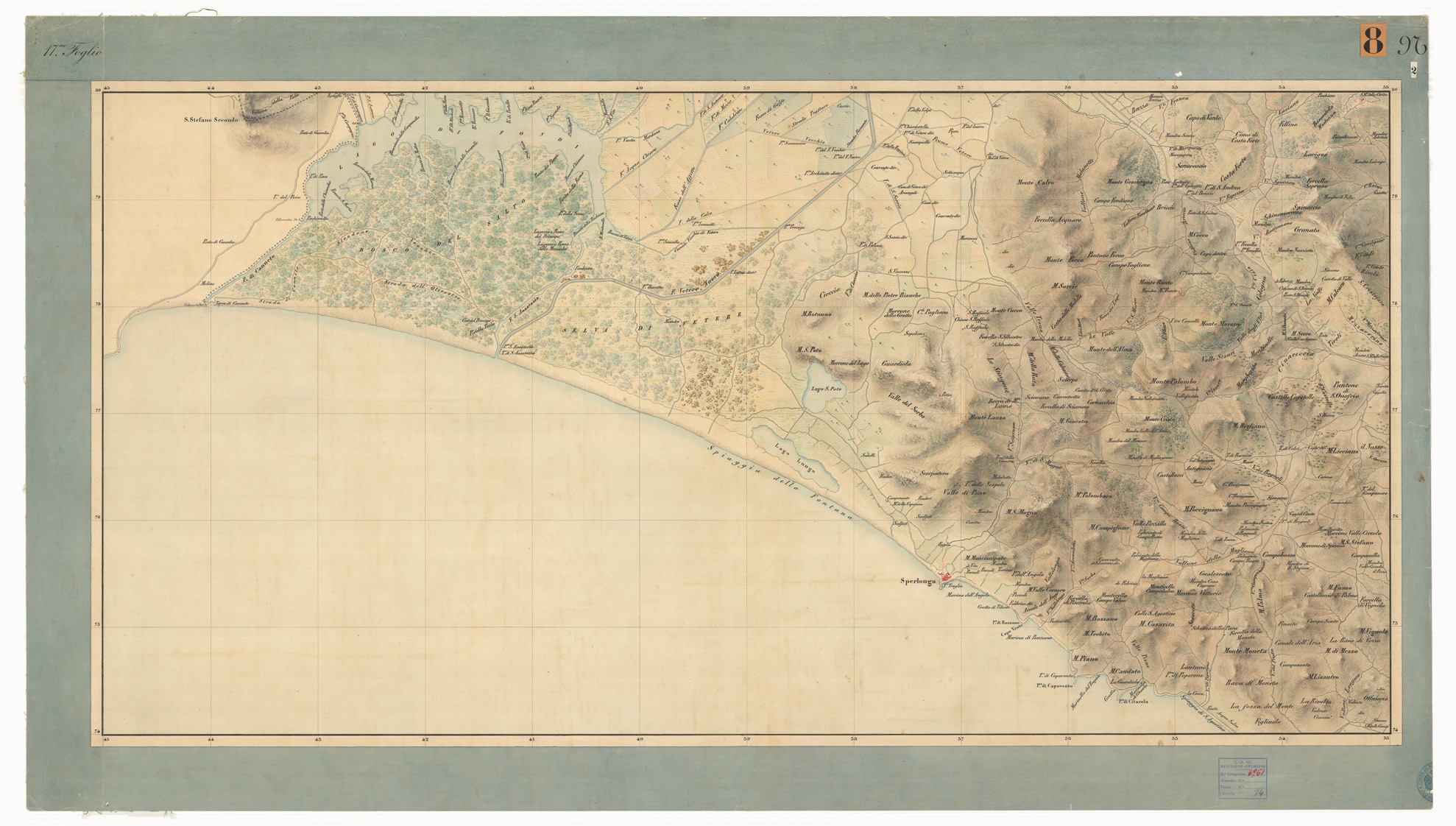 "Disegni originali della Carta dei dintorni di Napoli eseguiti nell'Officio Topografico dell'ex Regno di Napoli. Bella carta in 23 fogli montati su tela, disegnati ad acquarello. Rappresentano l'orografia col tratteggio in alcuni fogli sussidiato da curve di livello tracciate in bistro gli abitati sono in rosso le acque in azzurro vegetazioni e colture in verde strade in nero. Di notevole interesse per la ricchezza dei particolari e per la nitidezza del disegno."