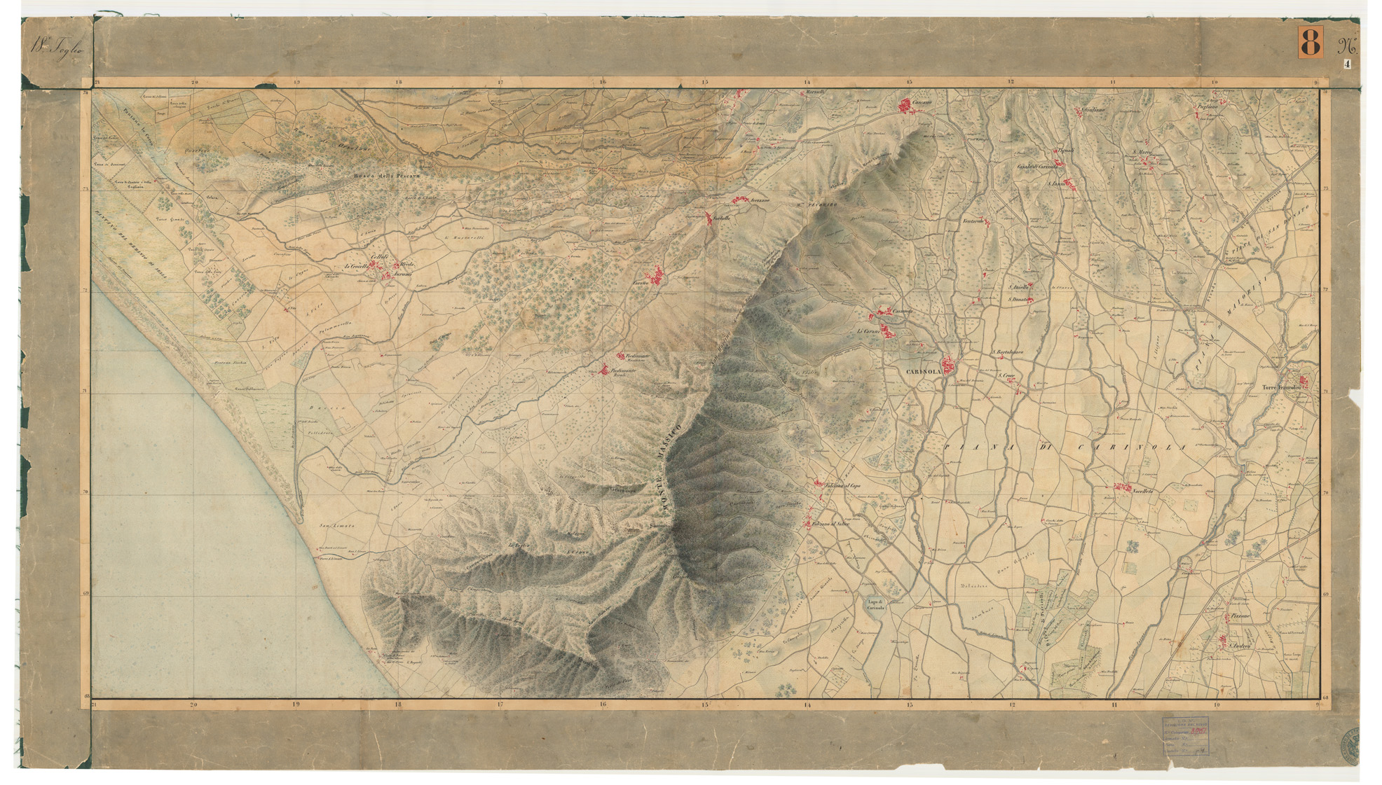 "Disegni originali della Carta dei dintorni di Napoli eseguiti nell'Officio Topografico dell'ex Regno di Napoli. Bella carta in 23 fogli montati su tela, disegnati ad acquarello. Rappresentano l'orografia col tratteggio in alcuni fogli sussidiato da curve di livello tracciate in bistro gli abitati sono in rosso le acque in azzurro vegetazioni e colture in verde strade in nero. Di notevole interesse per la ricchezza dei particolari e per la nitidezza del disegno."