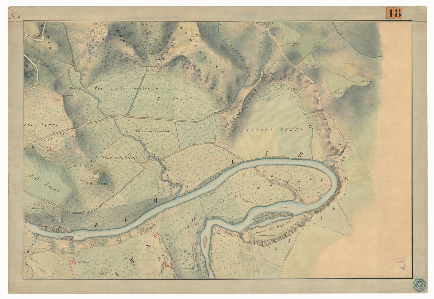 "SOTTO LA DIREZIONE DEL CAPITANO DEL GENIO FRANCESCO VERNEAU. Bella e grande carta in sei fogli montati su tela, pregevole particolarmente per la grande evidenza plastica data alle forme del terreno dimostrate mediante curve di livello tracciate all'equidistanza di 10 palmi (m. 2,60) sussidiate da artistico sfumo a luce obliqua. Gli abitati sono in rosso le acque in azzurro le vegetazioni e i terreni coltivi in verde. Il foglio N. 5 contiene il titolo e una nota relativa alla costruzione della carta la quale è basata su operazioni approssimate e su ricognizioni con quote esatte desunte in base a numerose e ripetute livellazioni. Il foglio N. 6 contiene un quadro delle quote altimetriche."