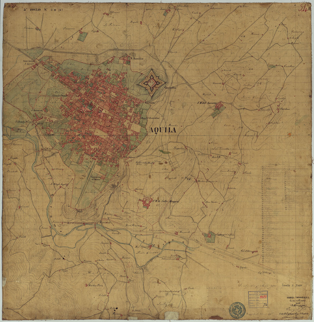 "Documento n. 25. Minuta di campagna dei rilievi eseguiti dall'Ing. Vincenzo di Carlo del R. Officio Topografico di Napoli con curve di livello tracciate in lapis, acque in azzurro, costruzioni in rosso, coltivazioni in verde. Foglio montato su tela. Vedi anche il documento AQUILA E DINTORNI - Copia in acquerello."