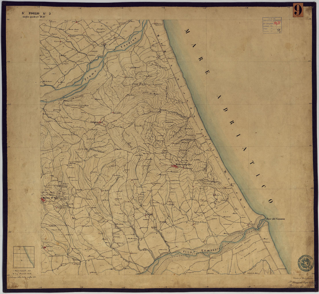 "Sono 167 tavolette montate su tela o seta, copiate e messe in netto all'Officio Topografico di Napoli su le levate eseguite dal 1834 al 1860 per la formazione della Carta del Reame di Napoli alla scala di 1:80.000. L'esecuzione di questa carta venne decretata nel 1814: essa fu però iniziata, dati i movimenti politici di quell'epoca, soltanto nel 1833. Queste tavolette si riferiscono ai fogli 1, 5, 8, 9, 12, 13, 17-19, 28, 29, 33 della suddetta carta la quale doveva essere disegnata ed incisa su rame a bulino con orografia a tratteggio e curve di livello tracciate alla equidistanza di 10 passi (m. 18,52) o di 52 passi (m. 92,60). Di essa peraltro furono pubblicati solamente cinque fogli, cioè: Napoli, Caserta, Gaeta, Leonessa, Cittaducale, tra il 1861 e 1870. L'I.G.M. conserva i rami dei primi tre di questi fogli. La carta all'80.000, pregevolissima per valore artistico e scientifico, venne giudicata superiore alle altre produzioni cartografiche contemporanee non solo italiane, ma europee (cfr. Mori A., La cartografia ufficiale in Italia e l'I.G.M. 1922, pag.107). Le tavolette sono disegnate a colori rosso per gli abitati, azzurro per le acque, verde per le vegetazioni, nero per le curve di livello, rete stradale, toponomastica e il rimanente della planimetria. Rappresentano l'orografia con le curve di livello, sostituite al sistema di tratteggio fino allora seguito, parte tracciate direttamente dagli operatori, parte completate a tavolino in base ai dati raccolti. Le tavolette sono suddivise a gruppi in base al foglio della carta all'80.000 cui si riferiscono ciascun gruppo reca annesso i nomi degli operatori e il visto del topografo capo. Annesso un "Quadro d'unione delle levate alla scala di 1:20.000 eseguite fino a tutto il 1860 dal R. Officio Topografico Napoletano" alla scala di 1:490.700, stampato nel 1884. Il documento è ripartito in Cart. d'Arch. n°75 (che comprende 52 fogli), n° 76 (48 fogli), n° 77 (44 fogli)."