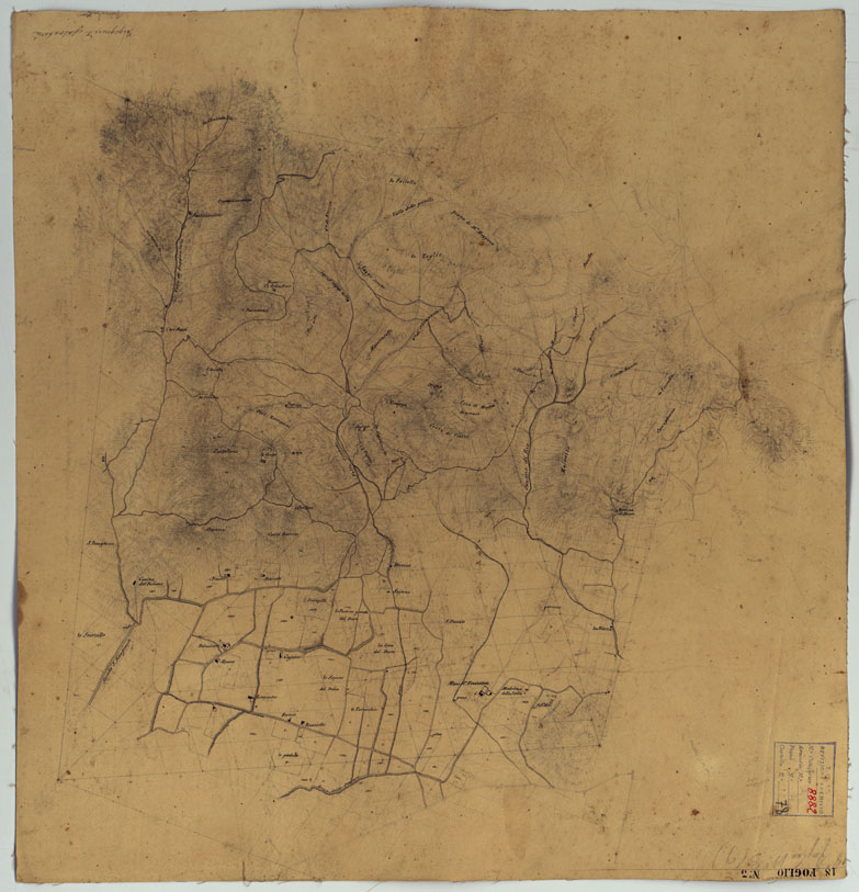 " Sono 88 minite di campagna di misure varie disegnati a colori, gli unici rimasti dopo che nel 1881 tali minute vennero dichiarate inutili da una Commissione appositamente riunitasi. Sono annessi grafici e schizzi. Foglio n. 3 Comune di appartenenza non individuato."