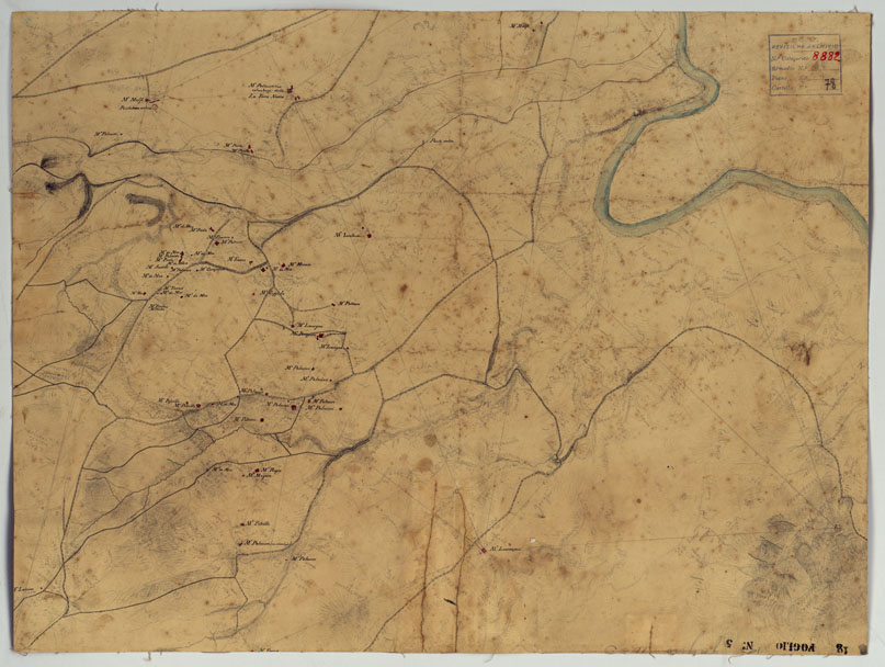 "Sono 88 minite di campagna di misure varie disegnati a colori, gli unici rimasti dopo che nel 1881 tali minute vennero dichiarate inutili da una Commissione appositamente riunitasi. Sono annessi grafici e schizzi. Foglio n. 5 Il comune inserito è presunto dal disegno topografico e dalla successione dei fogli."