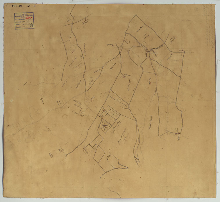 " Sono 88 minite di campagna di misure varie disegnati a colori, gli unici rimasti dopo che nel 1881 tali minute vennero dichiarate inutili da una Commissione appositamente riunitasi. Sono annessi grafici e schizzi. Foglio n. 8 La provincia è presunta dalla minuta in quanto facente parte del foglio n. 8."
