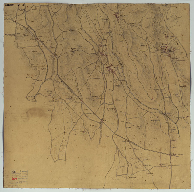 "Sono 88 minite di campagna di misure varie disegnati a colori, gli unici rimasti dopo che nel 1881 tali minute vennero dichiarate inutili da una Commissione appositamente riunitasi. Sono annessi grafici e schizzi. Foglio n. 8"