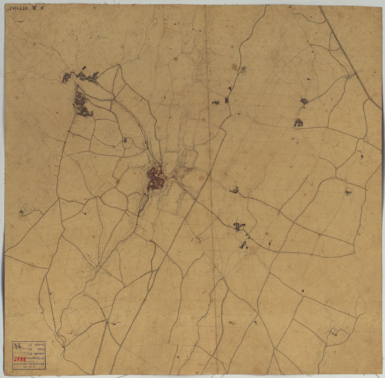 " Sono 88 minite di campagna di misure varie disegnati a colori, gli unici rimasti dopo che nel 1881 tali minute vennero dichiarate inutili da una Commissione appositamente riunitasi. Sono annessi grafici e schizzi. Foglio n. 8"