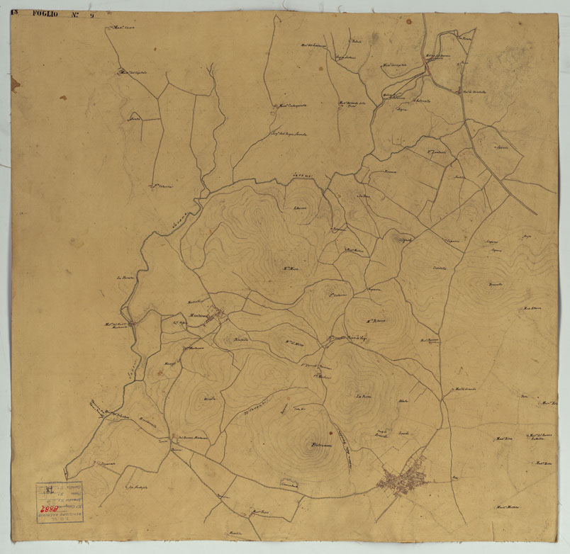 "Sono 88 minite di campagna di misure varie disegnati a colori, gli unici rimasti dopo che nel 1881 tali minute vennero dichiarate inutili da una Commissione appositamente riunitasi. Sono annessi grafici e schizzi. Foglio n. 9"
