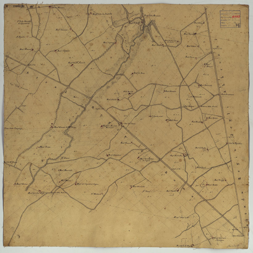 " Sono 88 minite di campagna di misure varie disegnati a colori, gli unici rimasti dopo che nel 1881 tali minute vennero dichiarate inutili da una Commissione appositamente riunitasi. Sono annessi grafici e schizzi. Foglio n. 9"