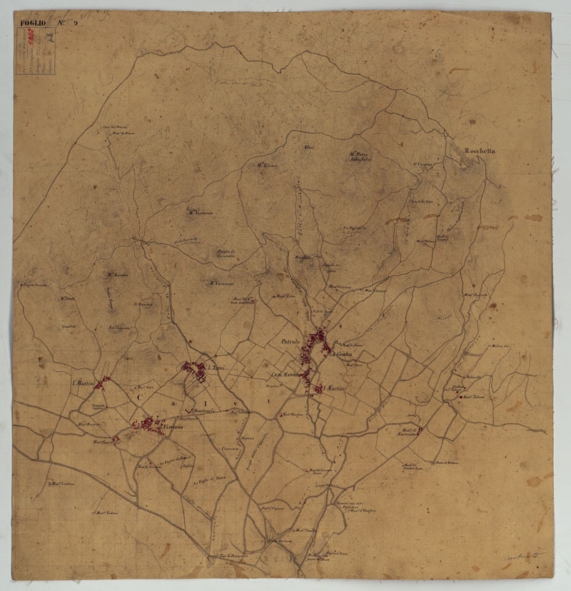 "Sono 88 minite di campagna di misure varie disegnati a colori, gli unici rimasti dopo che nel 1881 tali minute vennero dichiarate inutili da una Commissione appositamente riunitasi. Sono annessi grafici e schizzi. Foglio n. 9"