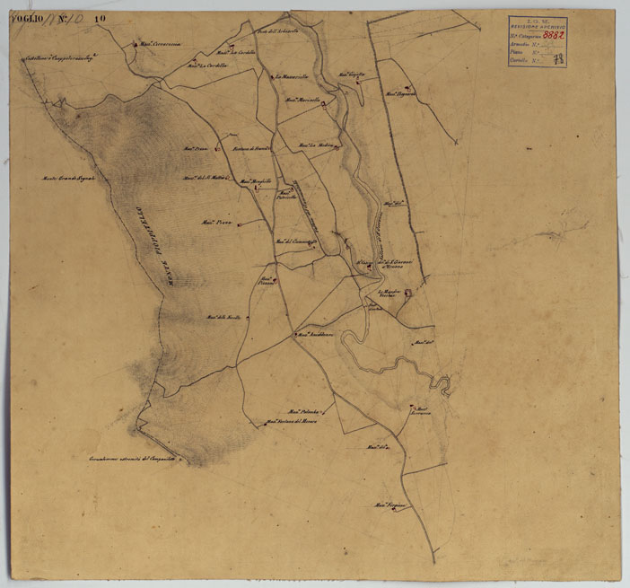 "Sono 88 minite di campagna di misure varie disegnati a colori, gli unici rimasti dopo che nel 1881 tali minute vennero dichiarate inutili da una Commissione appositamente riunitasi. Sono annessi grafici e schizzi. Foglio n. 10"