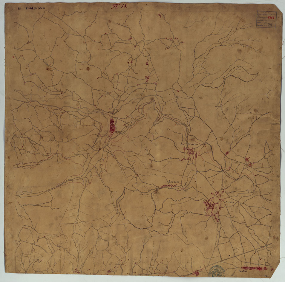 "Sono 88 minite di campagna di misure varie disegnati a colori, gli unici rimasti dopo che nel 1881 tali minute vennero dichiarate inutili da una Commissione appositamente riunitasi. Sono annessi grafici e schizzi. Foglio n. 18"