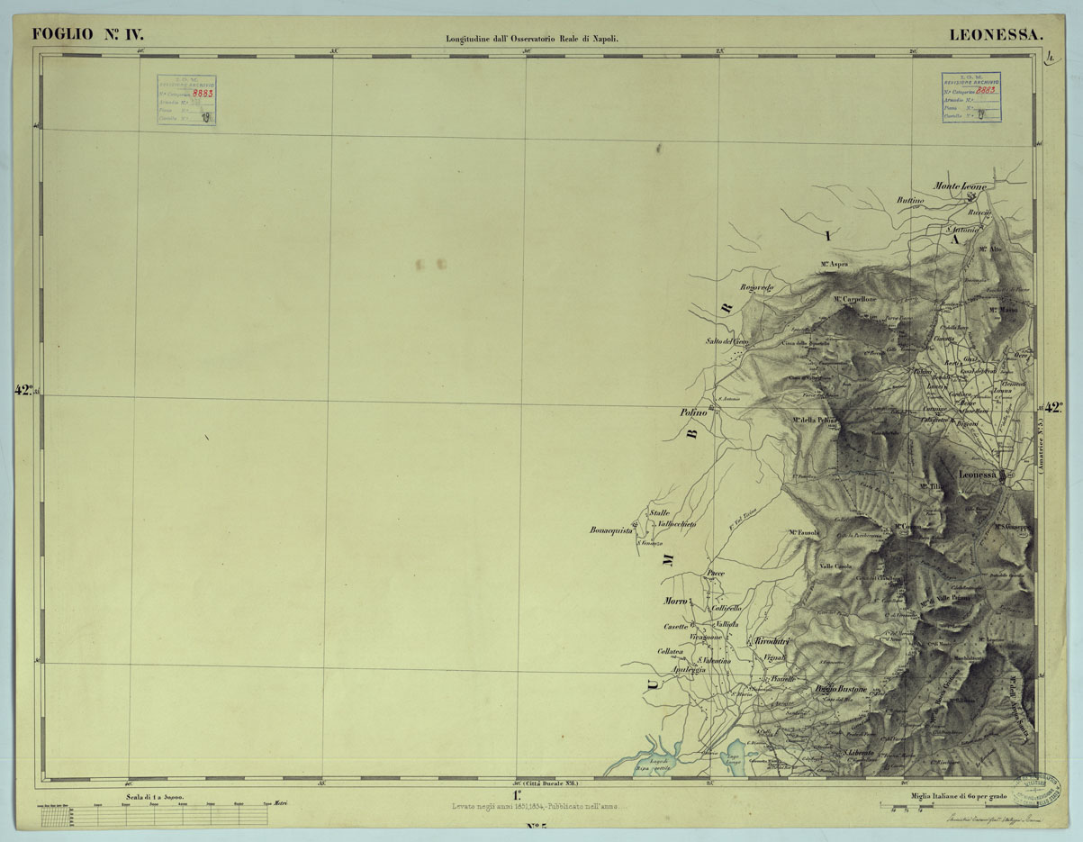"Sono 24 fogli modello che dovevano servire per una carta delle Provincie Meridionali alla scala di 1:50.000, disegnata su pietra sul tipo di quella del Piemonte alla stessa scala. Questa carta venne abbandonata quando fu decisa l'esecuzione della Carta d'Italia al 100.000. Questi fogli rappresentano l'orografia mediante un fine artistico tratteggio, acque in azzurro, rimanente in nero. Per nitidezza di diesegno ed evidenza di rappresentazione alcuni di essi, sono opera veramente pregevole. Non tutti i fogli sono completi: ognuno reca le firme degli operatori. Il titolo non è presente sulla carta."