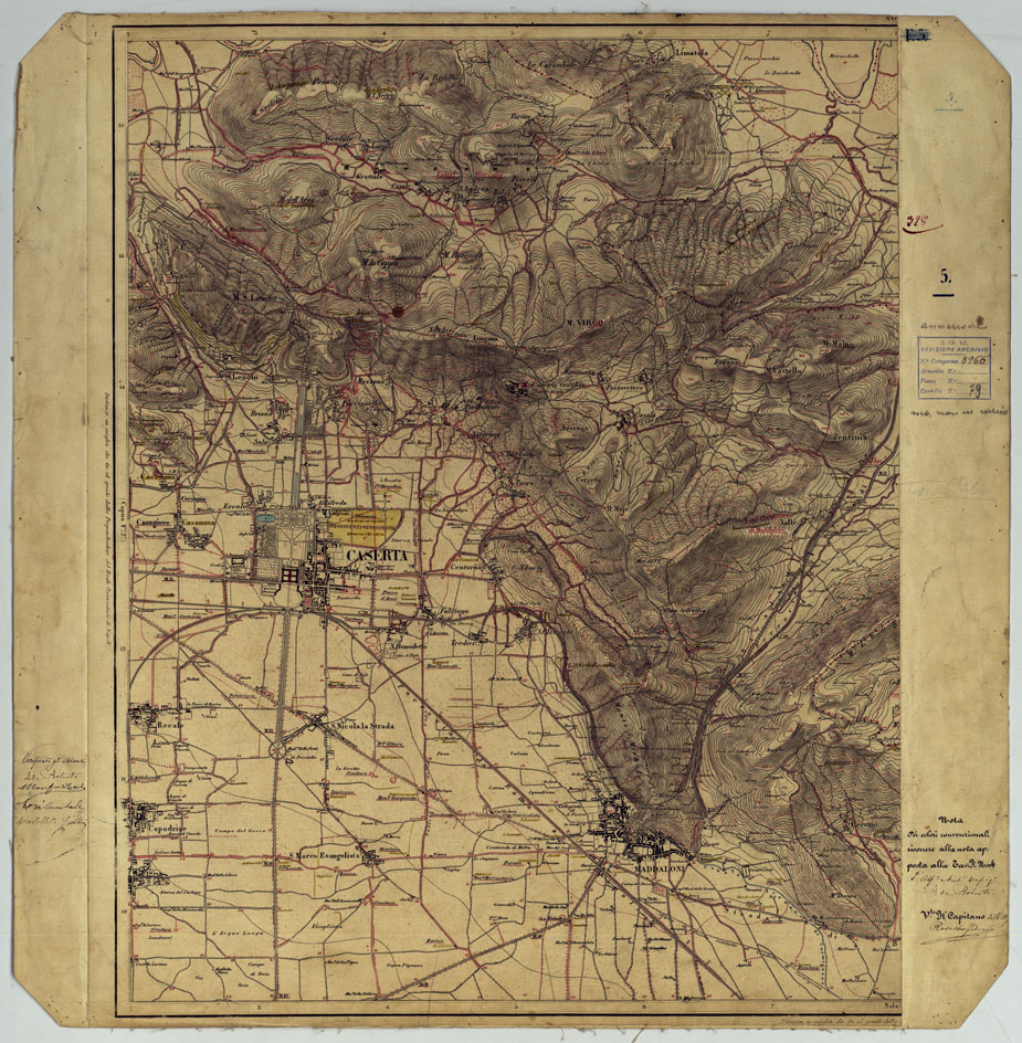 "Sono undici tavolette montate su tela, riconosciute nel 1876 da topografi dell'I.G.M. sopra copia tirate dai rami al 25.000 della Carta di Napoli e dintorni a quella stessa scala. In seguito a tali ricognizioni venne non soltanto aggiornata la planimetria, ma furono sostituite oltre al tratteggio le curve di livello tracciate all'equidistanza di 1o metri. Queste ricognizioni servirono per la formazione delle tavolette al 50.000 impiegate per la Carta d'Italia al 100.000. Ciascuna tavoletta reca il nome degli operatori e il visto del Capo-sezione Rosalba. Esse mostrano, segnate in rosso, tutte le correzioni e gli aggiornamenti notati durante i lavori di ricognizione. Annessi due fogli stampati (8 e 9) della suddetta carta di Napoli e dintorni eseguita dal R. Officio Topografico di Napoli e pubblicata in 15 fogli nel 1817-19, ove sono segnate le correzioni riportate dalle nuove levate."